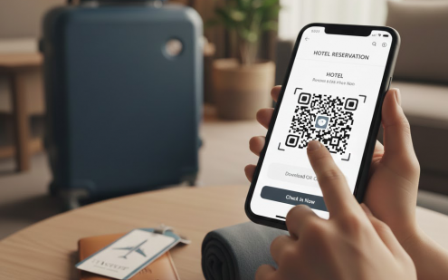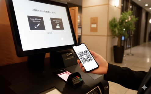 スマートチェックインとは、ご宿泊情報を改めて登録することなく、事前登録することでスムーズにチェックインができるサービスです。スマートフォンに送られたQRコードを、フロントに設置された専用端末にかざして本人確認をすることで、チェックイン時の登録作業を簡略化できます。